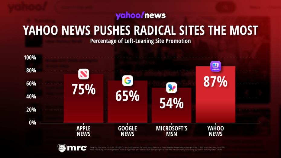 “Don’t overlook Yahoo’s ability to impact the narrative—and always from the left,” warned MRC President David Bozell. “Far from forgotten, Yahoo is the leftist boogeyman hiding in plain sight, and its massive reach and reliance on some of the worst of the worst leftist media outlets underscores its bias problem. Yahoo, like its Big Four News App counterparts, is harming Americans with its blatant agenda by providing an imbalance of coverage that overwhelmingly favors the left.”