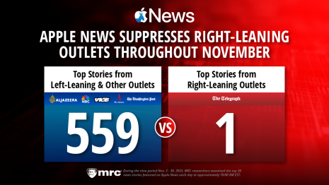MRC Free Speech America researchers began documenting the stories and outlets featured by Apple News in its top 20 stories each morning on Nov. 3, 2025. Human editors select the top stories on Apple News, which sets it apart from some competing Big Tech news aggregators that rely on automated algorithms, as reported by news outlets including the leftist New York Times.