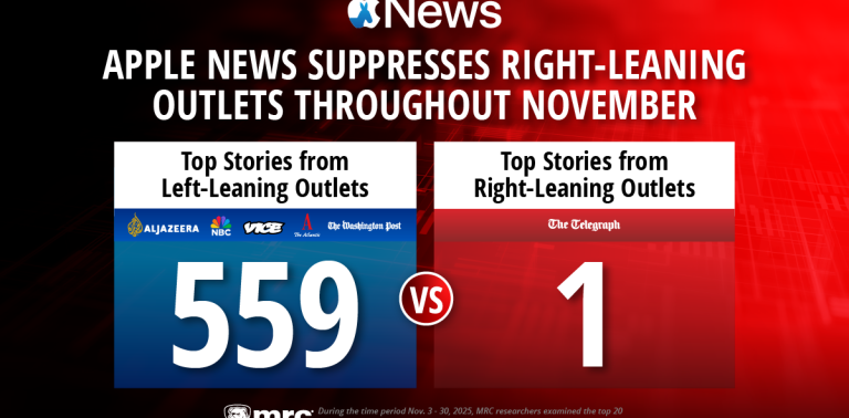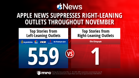 MRC Free Speech America researchers began documenting the stories and outlets featured by Apple News in its top 20 stories each morning on Nov. 3, 2025. Human editors select the top stories on Apple News, which sets it apart from some competing Big Tech news aggregators that rely on automated algorithms, as reported by news outlets including the leftist New York Times.