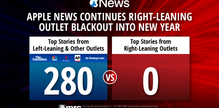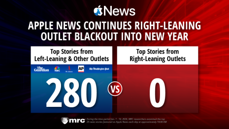 Methodology: During the time period Jan. 1 - Jan. 11, 2026, MRC researchers examined the top 20 AllSides-rated news stories featured on Apple News each day at approximately 10:00 AM ET and the top 20 AllSides-rated news stories between Jan. 12 - Jan. 14, 2026 at approximately 8:30 AM ET. MRC researchers used the AllSides media bias ratings, which categorize an outlet as “left,” “lean left,” “center,” “lean right” or “right” to determine the overall bias presented by Apple News and analyzed the results.