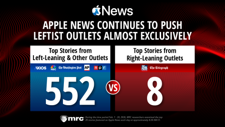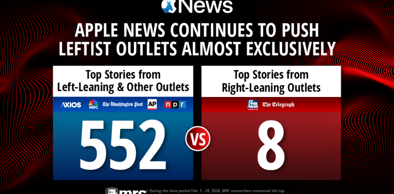 The Media Research Center tracked Apple News’s top 20 daily stories each morning during the month of February (totaling 560 stories) and found that the platform consistently amplified left-leaning outlets while suppressing right-leaning outlets.