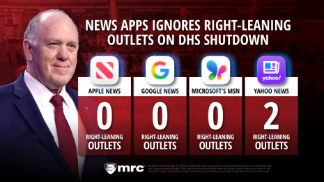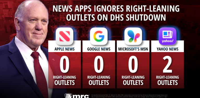 Methodology: During the time period Feb. 14 - March 14, 2026, MRC researchers examined the top 20 stories featured on the Big Four News Apps (Apple News, Google News, Microsoft’s MSN and Yahoo News) each day at approximately 8:30 AM ET and searched the article headlines for the terms “DHS,” “Homeland Security,” “shutdown” and “shut.” MRC researchers used the AllSides media bias ratings, which categorize outlets as “left,” “lean left,” “center,” “lean right” or “right” to determine the overall bias presented by the Big Four News Apps and analyzed the results.