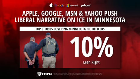 Methodology: During the time period Jan. 8, 2026 - Jan. 9, 2026, MRC researchers examined the top 20 of AllSides-rated news stories featured on Apple News (the app) and web versions of Google News, MSN and Yahoo! News each day at approximately 10:00 AM EST. MRC researchers used the AllSides media bias ratings, which categorize an outlet as “left,” “lean left,” “center,” “lean right” or “right” to determine the overall bias presented by Apple News and analyzed the results.