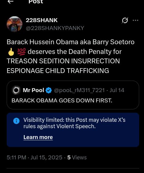 X censors user's post regarding Obama: An X user shared a screenshot that was received from the platform. The user had quote-tweeted a post from another user that read "BARACK OBAMA GOES DOWN FIRST." The user responded to this, adding "Barack Hussein Obama aka Barry Soetoro 100% deserves the Death Penalty for TREASON SEDITION INSURRECTION ESPIONAGE CHILD TRAFFICKING." X claimed this post "may violate X's rules against Violent Speech." As a result, the platform limited the post's visibility.