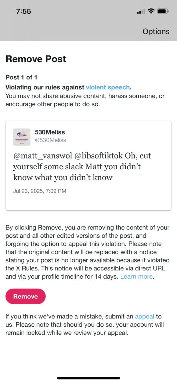 X censors user post for using a common euphemism: An X user shared a screenshot of his censorship notice. The user had posted "Oh, cut yourself some slack Matt you didn't know what you didn't know." X claimed this post violated its "rules against violent speech." The user was required to delete the post.