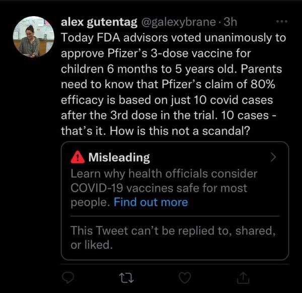 Twitter censors writer Alex Gutentag for citing information also included in Pfizer news release: Twitter claimed writer Alex Gutentag's COVID-19 tweet was "misleading." According to the purported screenshot, Gutentag tweeted, "Today FDA advisors voted unanimously to approve Pfizer's 3-dose vaccine for children 6 months to 5 years old. Parents need to know that Pfizer's claim of 80% efficacy is based on just 10 covid cases after the 3rd dose in the trial. 10 cases - that's it. How is this not a scandal?" A Twitter user called out the platform for fact-checking Gutentag's tweet for citing information that was also included in a Pfizer press release. Twitter claimed the post was "misleading" and restricted viewers ability to share, like or comment on the tweet. The notice advised viewers to "Learn why health officials consider COVID-19 vaccines safe for most people." At the time of publication, Twitter had removed the fact check notice from the tweet.