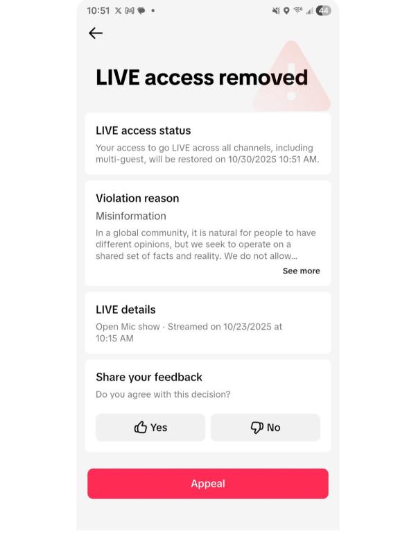 TikTok censors show on U.S. government strikes, alleging misinformation: Aly Legge, Director of Civic Engagement at Moms for America and co-host of The Homefront and Open Mic, posted on X Oct. 23, “Censored yet AGAIN on TikTok for my @openmicladies LIVE where we discussed and showed a video of our military taking care of Narco terrorists among other truths shared via Video! Not sure how any of it is ‘misinformation’ 🤷🏽♀️ . Guess I need a back up account!” She included a screenshot of TikTok’s message, which stated that her ability to go live would be restored on Oct. 30 and accused her of “Misinformation,” lecturing, “In a global community, it is natural for people to have different opinions, but we seek to operate on a shared set of facts and reality. We do not allow…” The rest of the message was not visible in the screenshot. The censored show streamed on Oct. 23 at 10:15 a.m.
