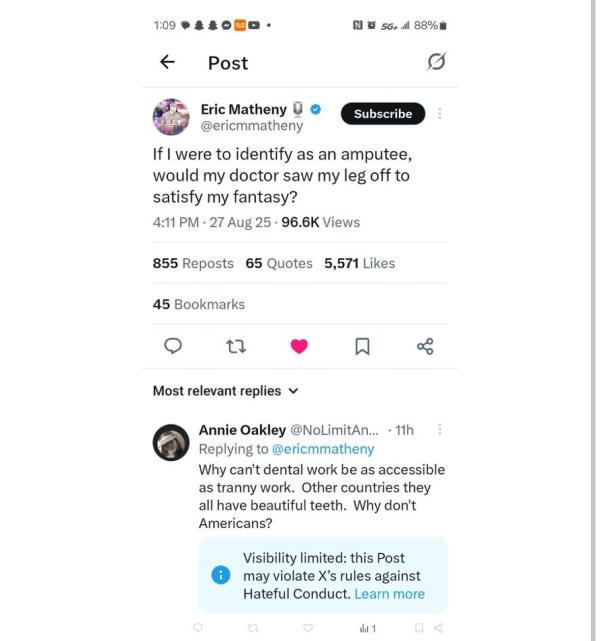 X limits visibility for post discussing “transgender” surgeries and dental care: Annie Oakley shared a screenshot on August 28 showing she had commented on another post, “Why can’t dental work be as accessible as tranny work. Other countries they all have beautiful teeth. Why don’t Americans?” X restricted the comment and imposed a label saying, “Visibility limited: this Post may violate X’s rules against Hateful Conduct.”