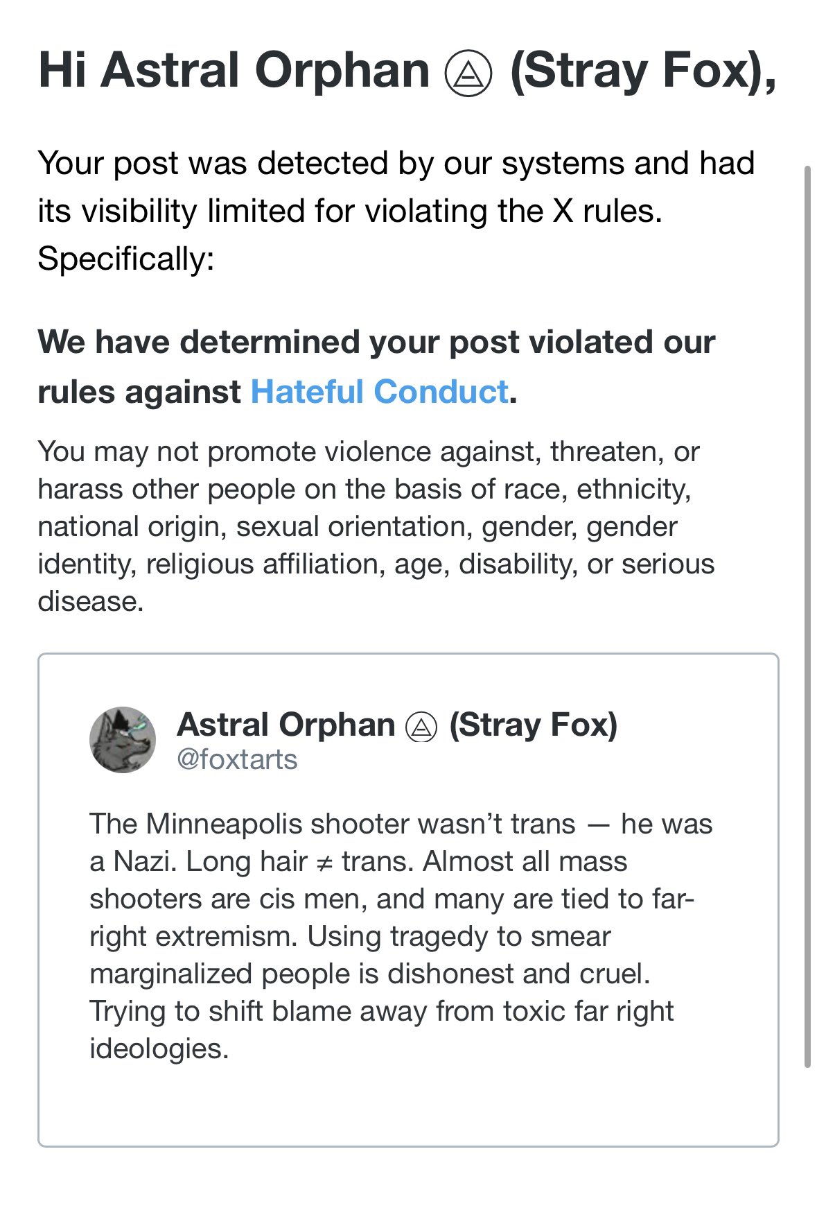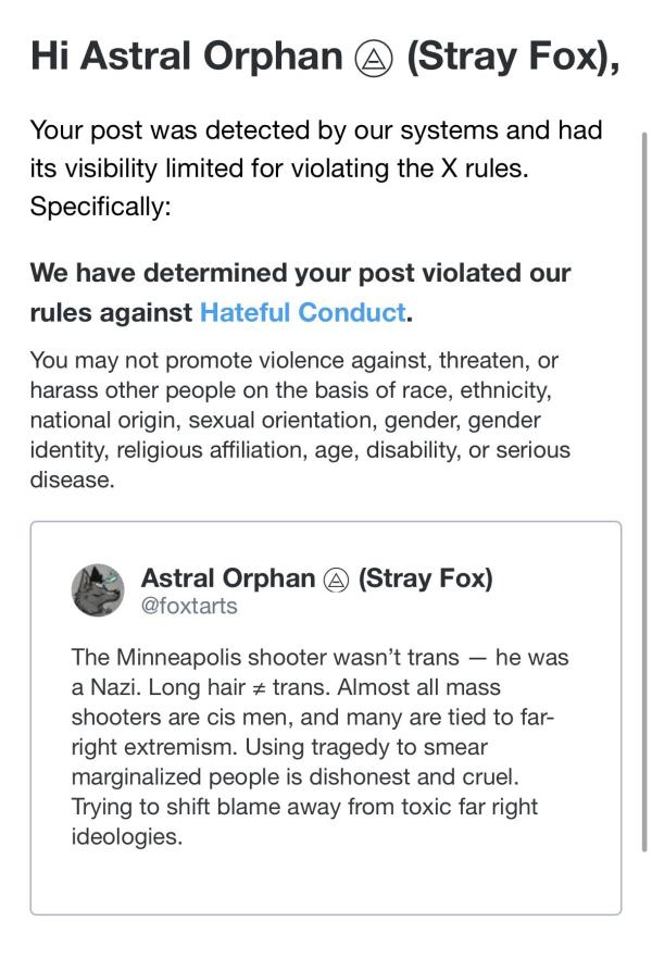 X censors user's post about Minneapolis shooter: An X user shared a screenshot of the censorship notice sent by X. The user had posted "The Minneapolis shooter wasn't trans - he was a Nazi. Long hair [does not equal] trans. Almost all mass shooters are cis men, and many are tied to far-right extremism. Using tragedy to smear marginalized people is dishonest and cruel. Trying to shift blame away from toxic far right ideologies." X flagged the post, stating that its visibility had been limited because it "violated our rules against Hateful Conduct."