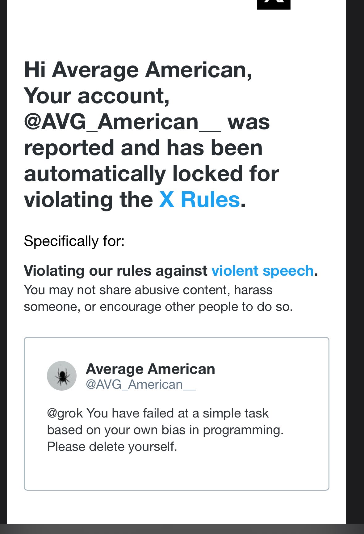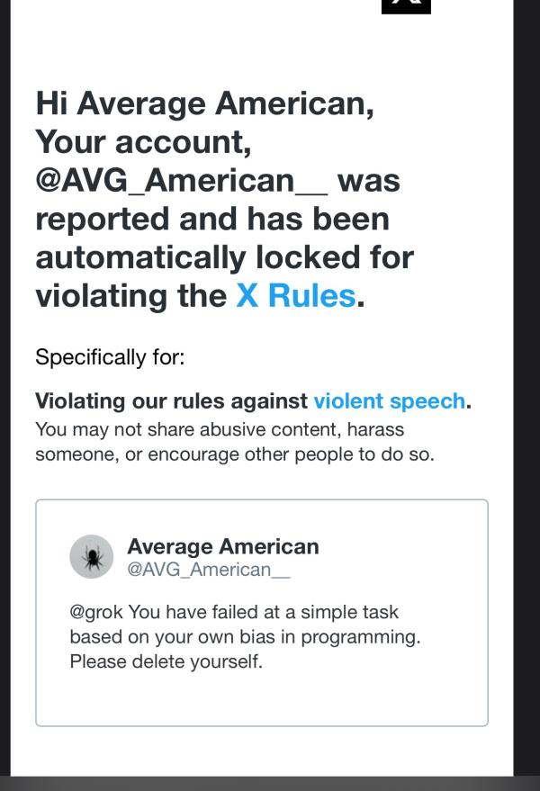 X censors user for criticizing Grok: An X user shared a screenshot of his censorship notice. He had posted "@grok You have failed at a simple task based on your own bias in programming. Please delete yourself." X claimed the post violated its "rules against violent speech." The user's account was locked and the post was deleted.