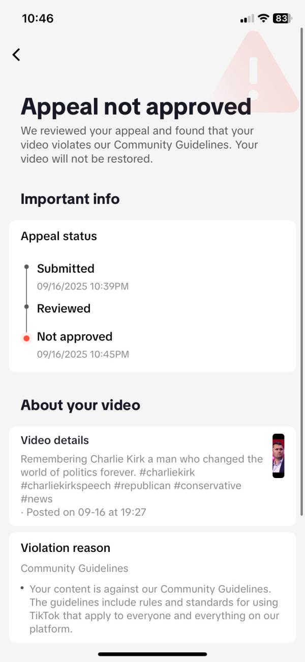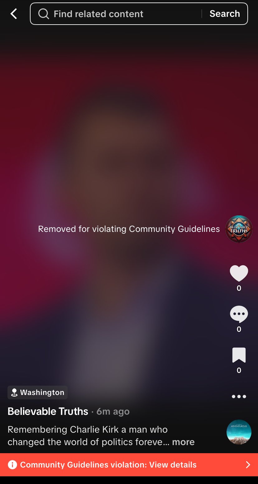 TikTok removes video tribute to Charlie Kirk: An X user shared a screenshot of his TikTok censorship notice. He had posted a short video in which he honored Charlie Kirk's legacy. The video did not include any graphic imagery or even any mention of the assassination. However, TikTok claimed the video violated its "Community Guidelines," though it did not specify how. The video was captioned "Remembering Charlie Kirk a man who changed the world of politics forever. #charliekirk #charliekirkspeech #republican #conservative #news."