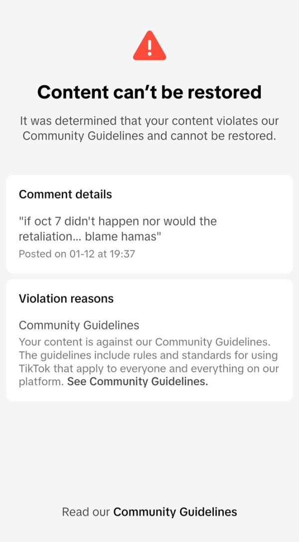 TikTok censors user for comment about October 7: An X user shared a screenshot of his TikTok censorship notice. The user had posted a comment that read "if octopus 7 didn't happen nor would the retaliation... blame hamas." According to the screenshot, TikTok claimed the post violated its community guidelines but did not state how. The platform removed the post.