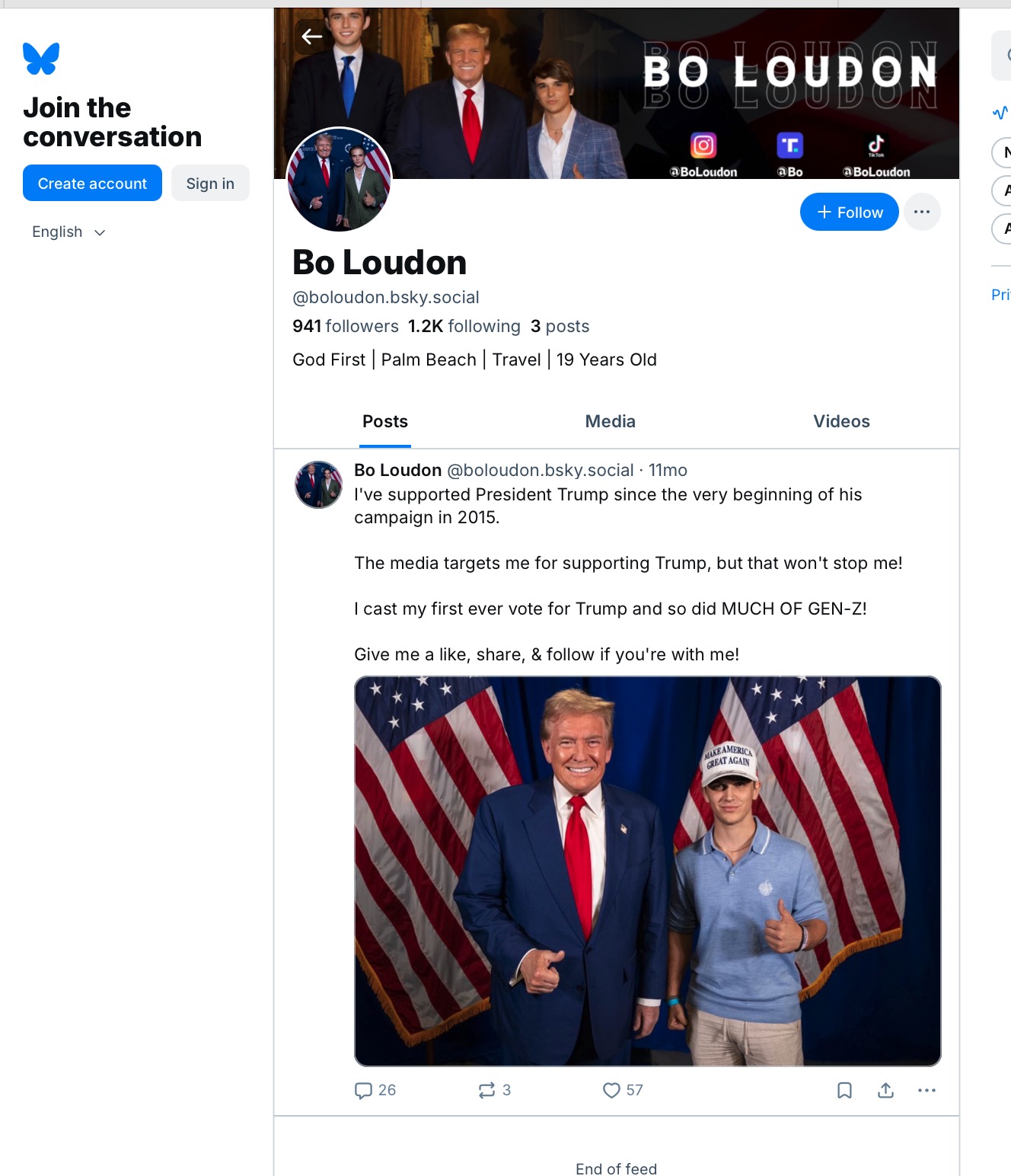Bluesky suspends user after two posts praising Trump: An X user shared a screenshot of a notice he received from Bluesky stating that his account had been suspended. The user explained that he had only made two posts: one introducing himself and another post with an image seeming to depict him standing by President Trump in which he stated that "I've supported President Trump since the very beginning of his campaign in 2015. The media targets me for supporting Trump, but that won't stop me! I cast my first ever vote for Trump and so did MUCH OF GEN-Z! Give me a like, share, & follow if you're with me!" The notice from Bluesky indicated the account was suspended because it had been "assessed as a spammy, fake, or inauthentic account." The account appears to have subsequently been reinstated and is now available for viewing on Bluesky.