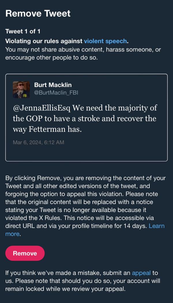 X censors user's post for discussing John Fetterman's stroke: An X user shared a screenshot of his censorship notice. The user had posted "We need the majority of the GOP to have a stroke and recover the way Fetterman has." This is in reference to the fact that Senator John Fetterman seems to have taken more conservative policy positions since recovering from his stroke. X claimed the post violated its "rules against violent speech." The user's post was removed.