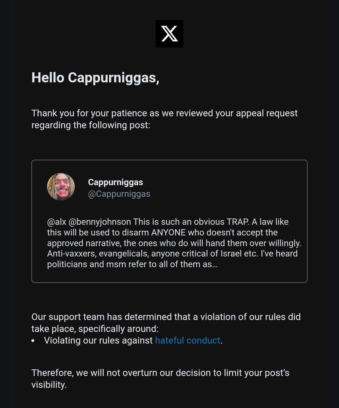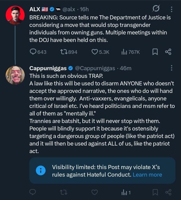 X censors user's post discussing disarming transgenders: An X user shared a screenshot of her censorship notice. The user had posted "This is such an obvious TRAP. A law like this will be used to disarm ANYONE who doesn't accept the approved narrative, the ones who do will hand them over willingly. Anti-vaxxers, evangelicals, anyone critical of Israel etc. I've heard politicians and msm refer to all of them as 'mentally ill.' Trannies are batshit, but it will never stop with them. People will blindly support it because it's ostensibly targeting a dangerous group of people (like the patriot act) and it will then be used against ALL of us, like the patriot act." The user's comment's visibility was limited by X citing its "rules against hateful conduct."