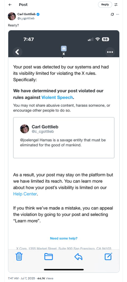 X censors user for calling out Hamas: An X user shared a screenshot of a censorship notice issued by the platform. The flagged post stated, "@joelengel Hamas is a savage entity that must be eliminated for the good of mankind." X claimed the post violated its rules against violent speech and restricted its visibility.