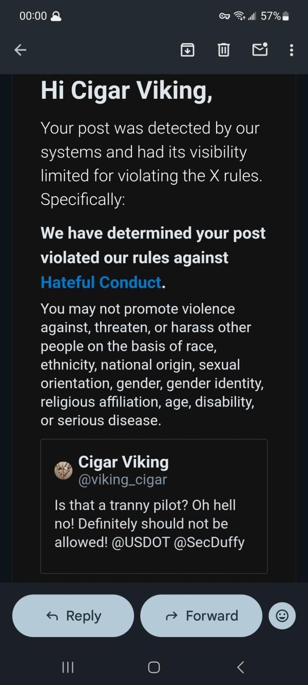X censors user's post discussing transgenderism: An X user shared a screenshot of his censorship notice. The user had posted "Is that a tranny pilot? Oh hell no! Definitely should not be allowed! @USDOT @SecDuffy." The user's comment visibility was limited by X citing its "rules against hateful conduct."