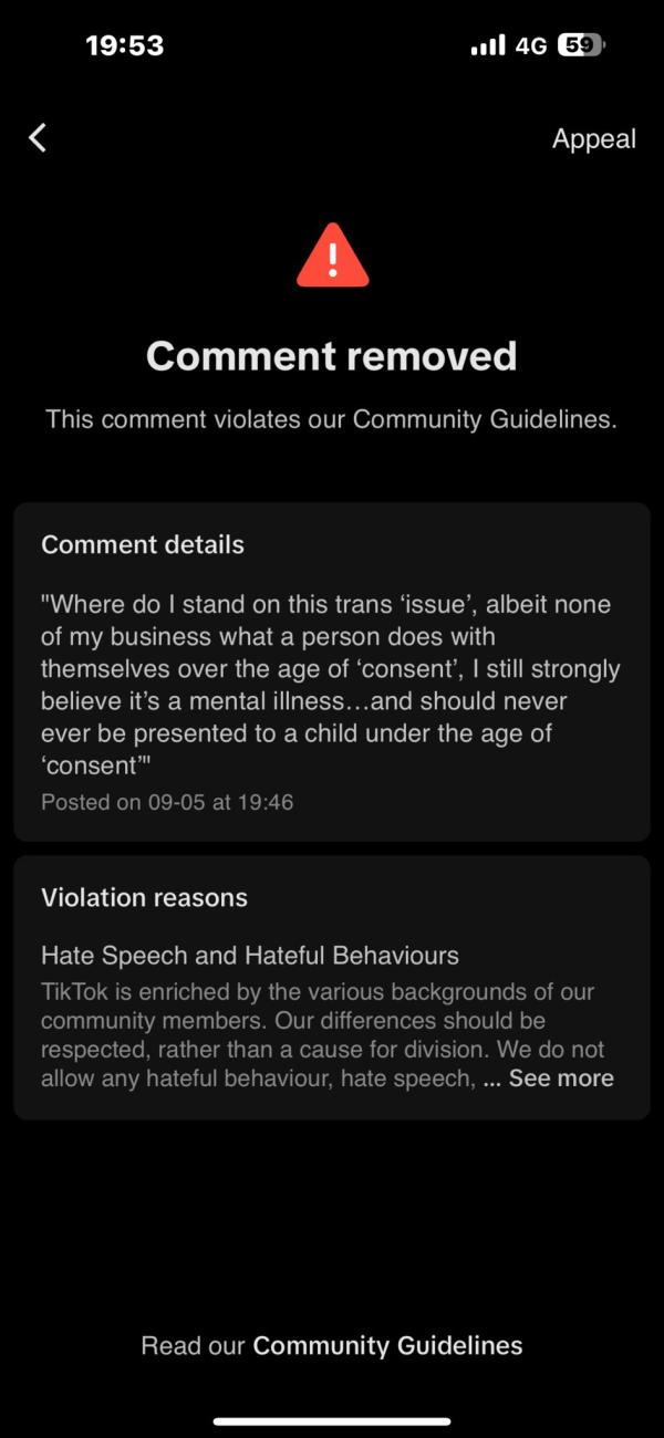 TikTok removes comment about transgenderism: An X user shared a screenshot of his TikTok censorship notice. The user had posted "Where do I stand on this trans 'issue', albeit none of my business what a person does with themselves over the age of 'consent', I still strongly believe it's a mental illness...and should never ever be presented to a child under the age of 'consent.'" TikTok removed the comment, stating that it violated the platform's community guidelines regarding "Hate Speech and Hateful Behaviours."