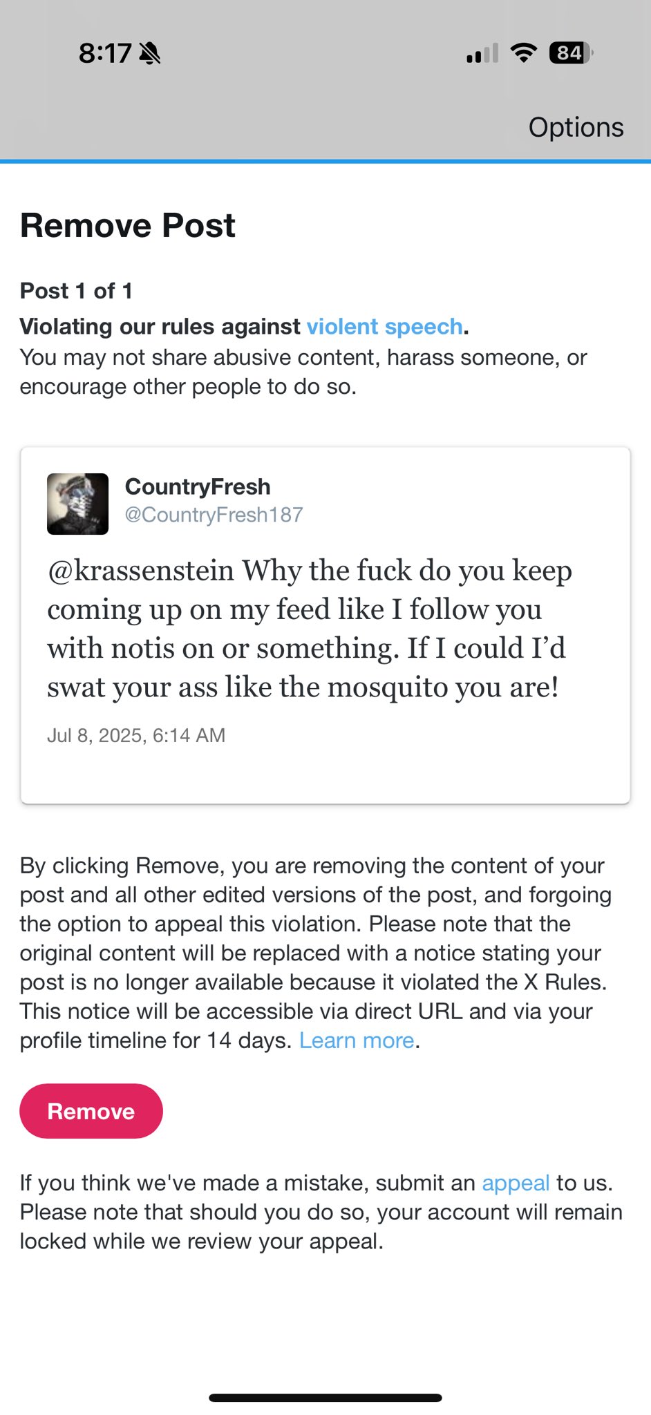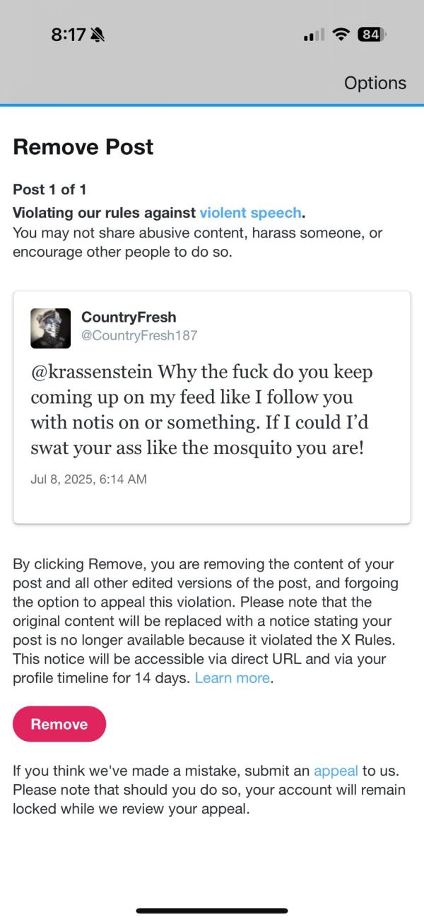 X censors user's post about Brian Krassenstein: An X user shared a screenshot of a censorship notice he received from the platform. The user had posted "@krassenstein Why the fuck do you keep coming up on my feed like I follow you with notis on or something. If I could I'd swat your ass like the mosquito you are!"" The user's post was required to be deleted, citing X's "rules against violent speech."