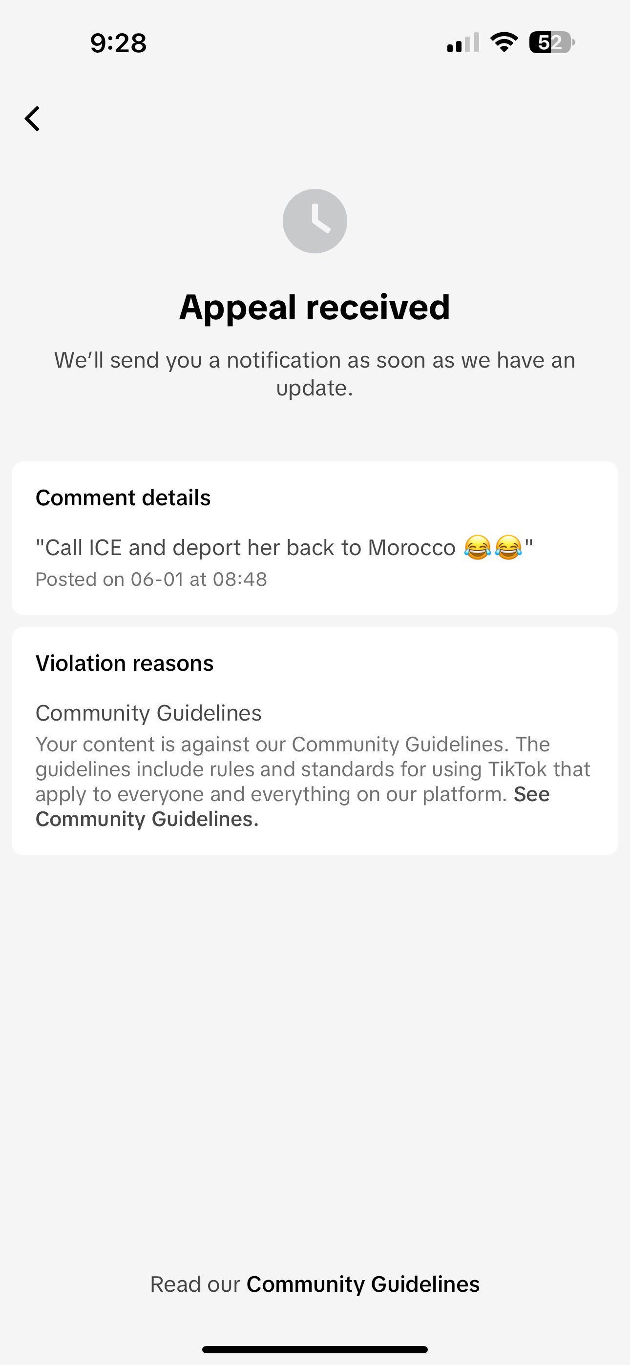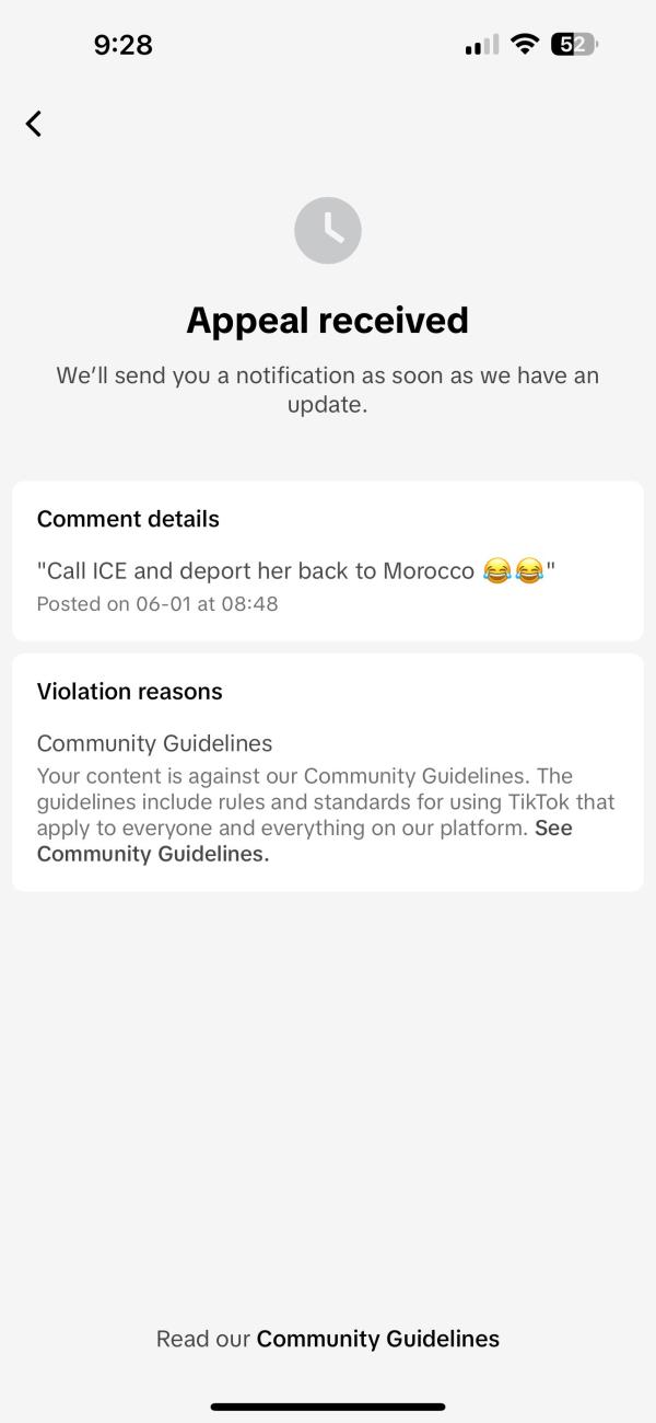 TikTok removed user's comment: An X user shared a screenshot of the censorship notice he received from TikTok. The user had commented "Call ICE and deport her back to Morocco." TikTok removed the comment, claiming that it violated the platform's "Community Guidelines," but did not indicate how.