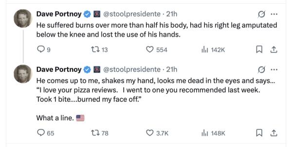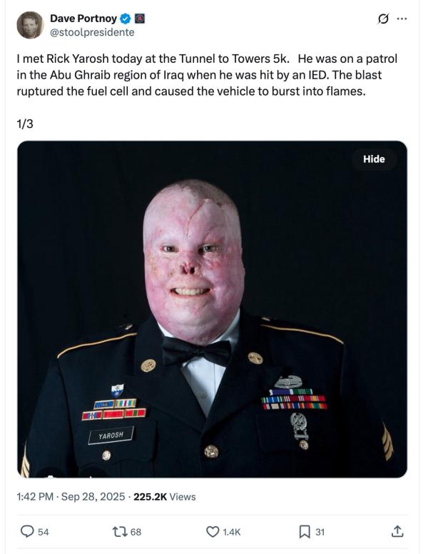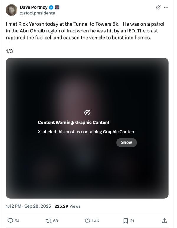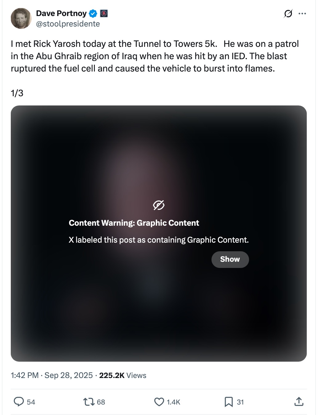 X censors picture of injured soldier: Barstool Sports founder Dave Portnoy shared a heartfelt story on his X timeline. He related the story of meeting Rick Yarosh, a soldier who was hit by an IED while on patrol in Abu Ghraib. According to Portnoy, Yarosh "suffered burns over more than half his body, had his right leg amputated below the knee and lost the use of his hands." Portnoy related the joke that Yarosh made upon meeting him, making fun of his own appearance by saying "I love your pizza reviews. I went to one you recommended last week. Took 1 bite...burned my face off." Portnoy shared a photo of Yarosh in his uniform to accompany the story. X placed a sensitive content filter over Yarosh's picture. Such filters do not allow users on the mobile app who have the sensitive filter enabled on their profile, the default setting, to view the filtered content at all. On the web version of X, the users must click through the sensitive content interstitial in order to view the filtered content. Not only do such filters give the impression of inappropriate content, similar filters have been shown to reduce user interaction with content.
