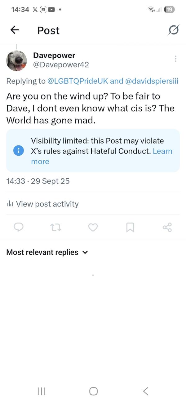 X censors user's post that contains "cis": An X user responded to another user, saying "Are you on the wind up? To be fair to Dave, I dont even know what cis is? The World has gone mad." X claimed the post "may violate X's rules against Hateful Conduct." As a result, the platform limited the post's visibility.