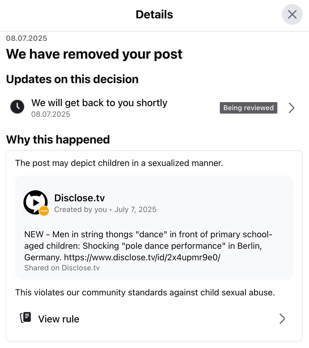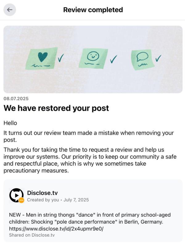 Facebook censored post bringing attention to "possible child abuse" citing its policy against "child sexual abuse": Disclose.tv posted a screenshot of a Facebook censorship notice it received to its X channel. The caption that it included with the video it posted to its Facebook account read "NEW - Men in string thongs 'dance' in front of primary school-aged children: Shocking 'pole dance performance' in Berlin, Germany." Facebook removed the post, according to the screenshot, claiming it violated the platform's "community standards against child sexual abuse." Later the same day, Disclose.tv posted an update on X saying that Facebook had restored the post, and included a screenshot of the notice Facebook sent explaining this action. However, the following day, Disclose.tv noted on X that Facebook had once again removed the post. No further updates are available at this time.