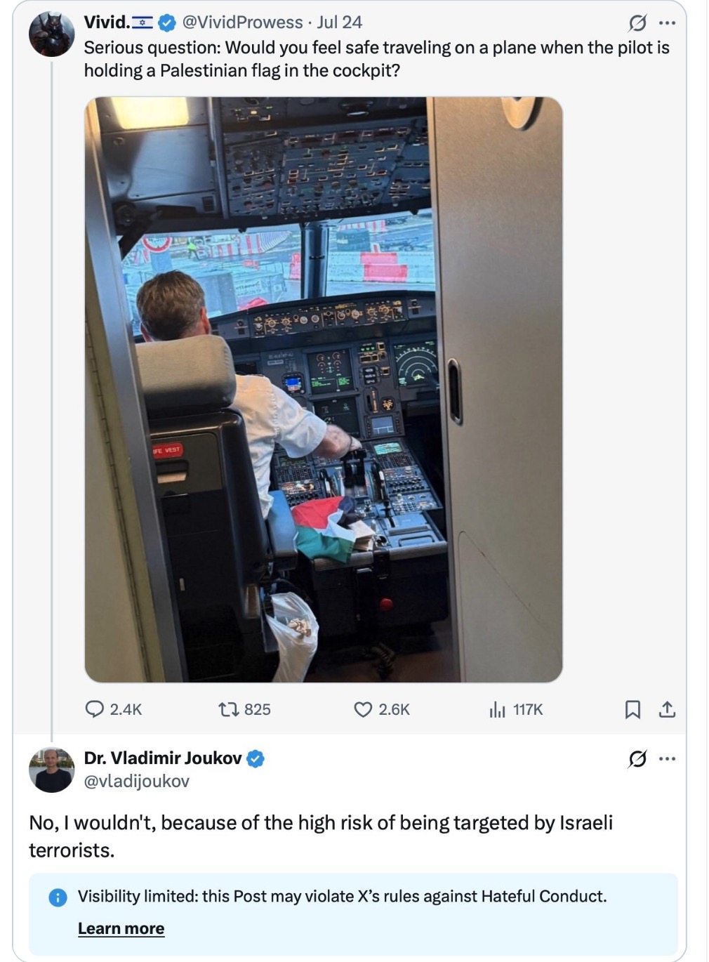 X censors user's post: An X user shared a screenshot of the censorship notice sent by X. The user had posted in response to an image of a commercial airplane cockpit with a pilot sitting next to an apparent Palestinian flag on the controls, where the user who posted the photo had asked "Serious question: Would you feel safe traveling on a plane when the pilot is holding a Palestinian flag in the cockpit? The censored user responded, saying "No, I wouldn't because of the high risk of being targeted by Israeli terrorists." X flagged the post, stating that its visibility had been limited because it "may violate X's rules against Hateful Conduct."