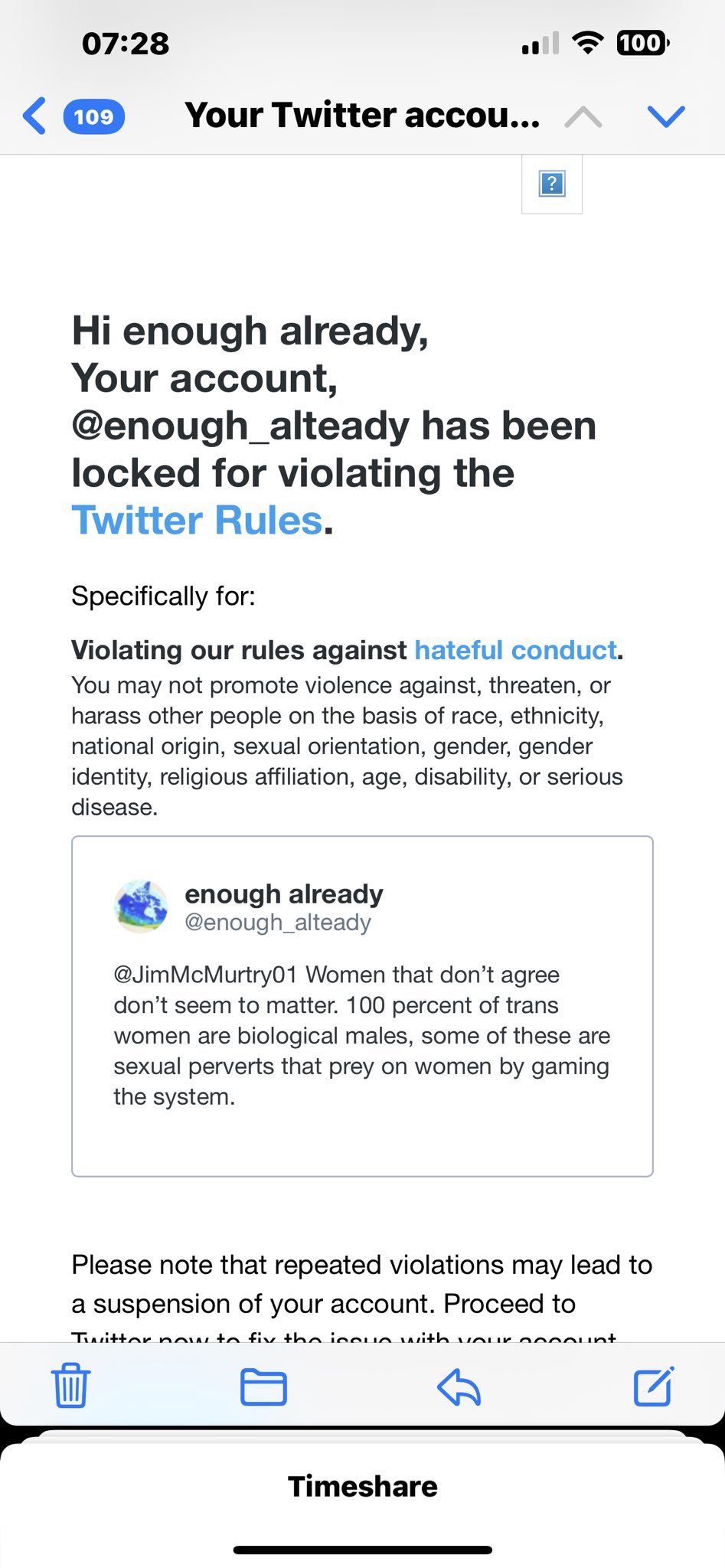 X censors user's post about transgenderism: An X user shared a screenshot of the censorship notice received from the platform. The user had posted "Women that don't agree don't seem to matter. 100 percent of trans women are biological males, some of these are sexual perverts that prey on women by gaming the system." X claimed this post violated its "rules against hateful conduct." The post was deleted and the user's account was locked for one week.