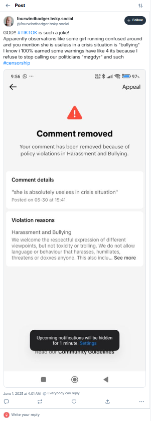 TikTok removes user's comment: A Bluesky user shared a screenshot of a censorship notice from TikTok. The flagged comment read: "she is absolutely useless in crisis situation." TikTok claimed the comment violated its policy on harassment and bullying and subsequently removed it.
