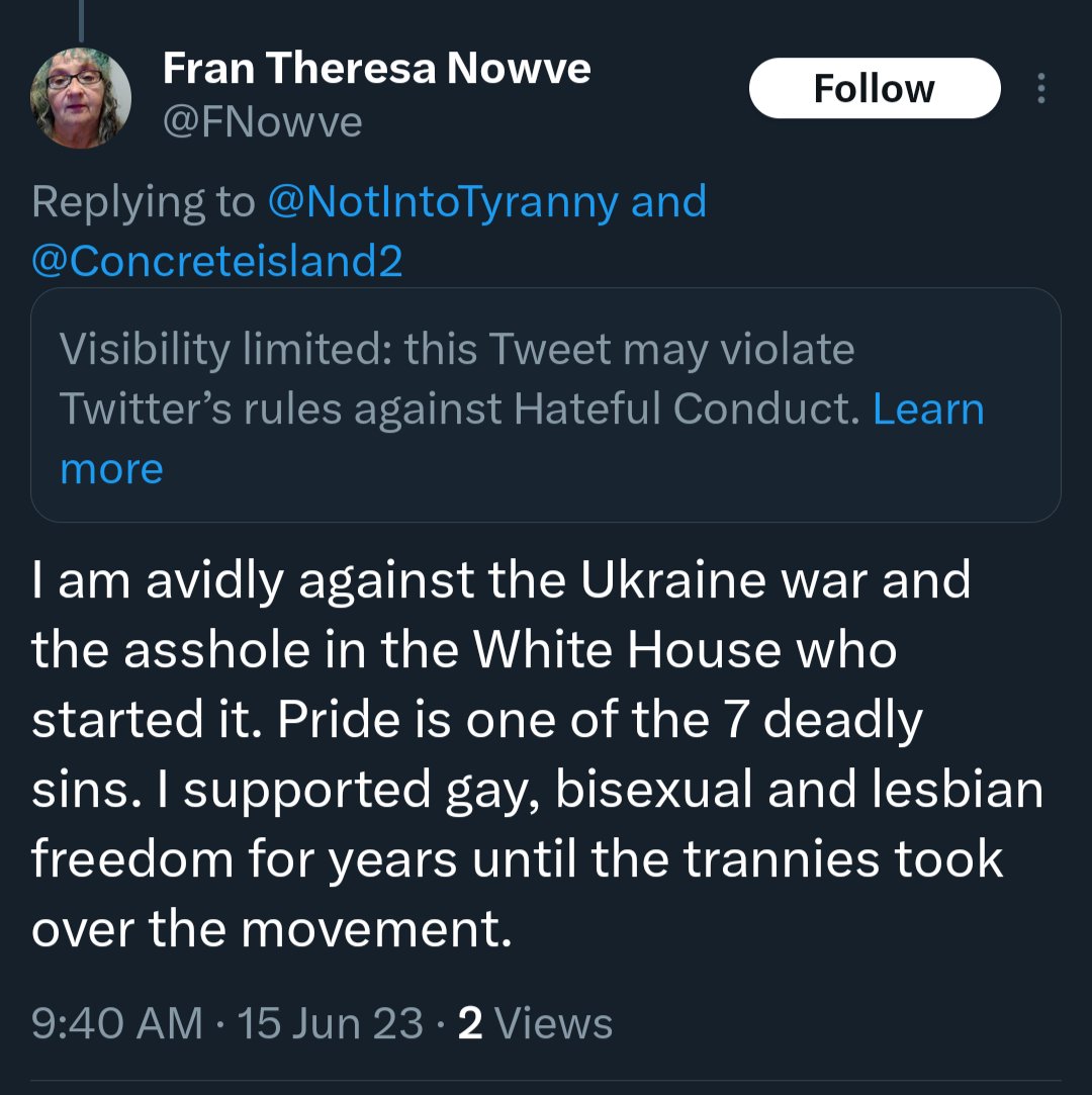 X censors user's post giving her positions on several controversial policy issues: An X user shared a screenshot of another user's censorship notice. The censored user posted "I am avidly against the Ukraine war and the asshole in the White House who started it. Pride is one of the 7 deadly sins. I supported gay, bisexual and lesbian freedom for years until the trannies took over the movement." X limited the visibility of her post, citing its "rules against Hateful Conduct."