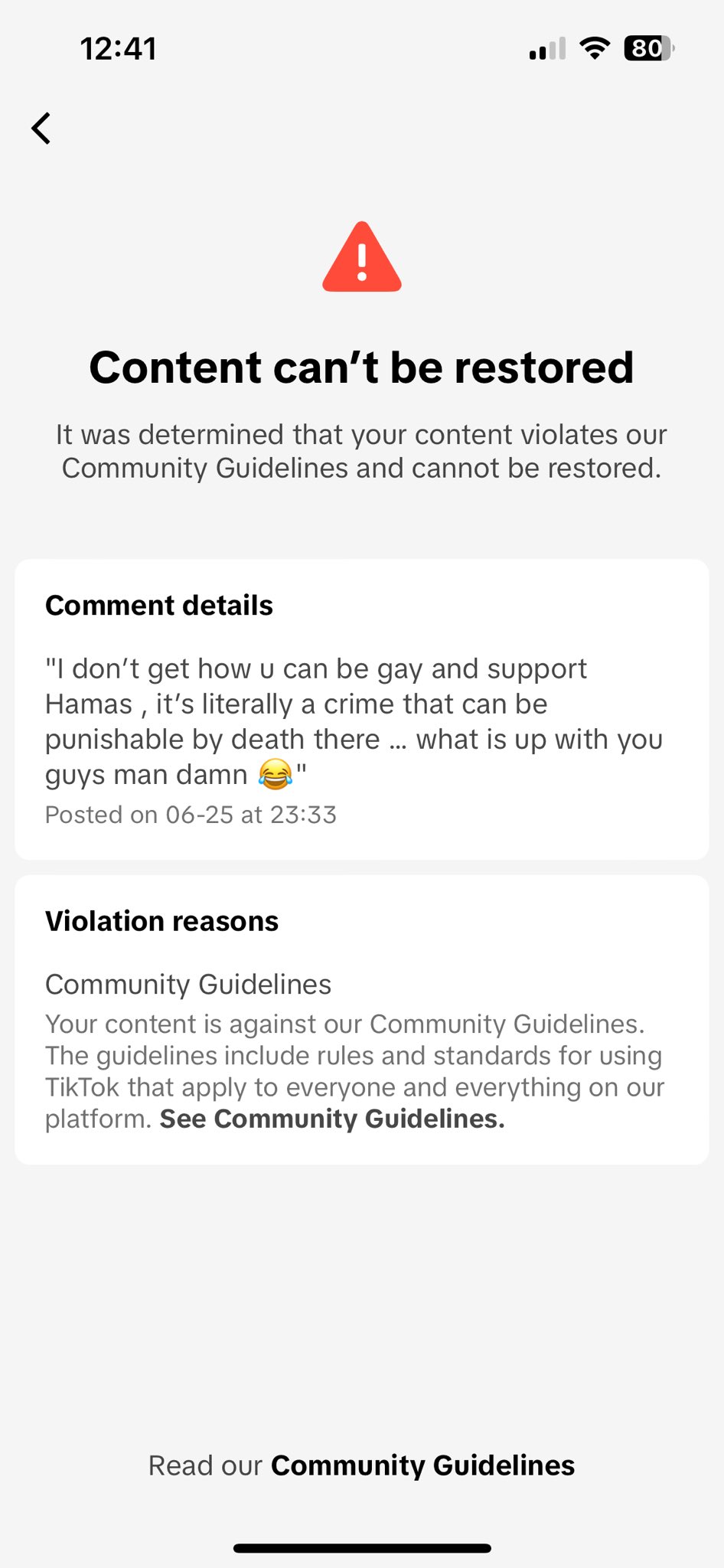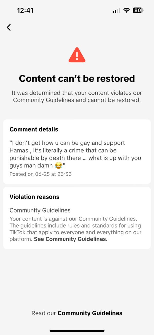 TikTok removes comment about LGB support for Hamas: An X user shared a screenshot of his TikTok censorship notice. The user had posted "I don't get how u can be gay and support Hamas , it's literally a crime that can be punishable by death there ... what is up with you guys man damn." TikTok removed the comment, stating that it violated the platform's community guidelines, but did not specify which one.