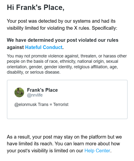 X censors user for claim about transgender people: An X user shared a screenshot of his censorship notice. The user had posted "@elonmusk Trans = Terrorist." The post was flagged by X as violating the "rules against Hateful Conduct." X limited the visibility of the post as a result of the finding.