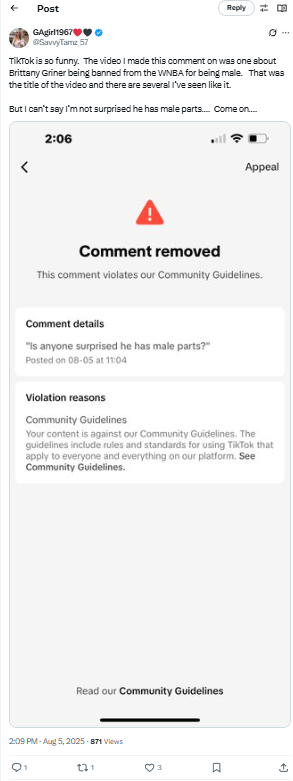 TikTok removes comment on gender: An X user shared a screenshot of a censorship notice from TikTok after the platform removed her comment. The flagged comment read: "Is anyone surprised he has male parts?" TikTok claimed the comment violated its community guidelines but did not indicate how.