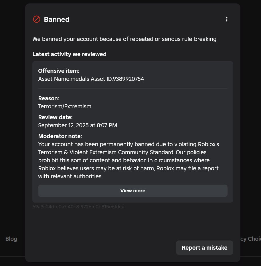 Roblox banned user's account for adding medals to his avatar in-game: An X user shared a screenshot of his Roblox censorship notice. The user's account on Roblox was banned. According to the notice sent to the user, the last infraction involved the user adding an "Offensive item" to his in-game avatar named "medals Asset ID.9389920754." The user indicated that this was "a Napoleonic Wars RP thing." Roblox considered the item "Terrorism/Extremism," and banned the user's account.