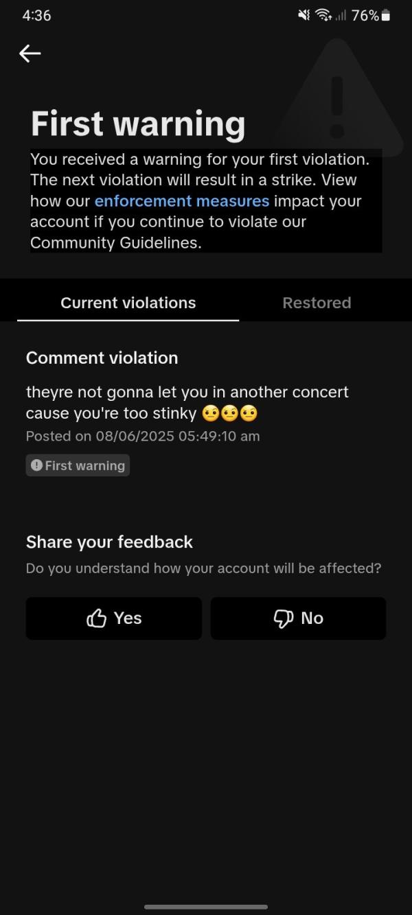 TikTok issues user "first warning" for calling his brother "stinky": An X user shared a screenshot of his TikTok censorship notice. The user had "commented ... on [his] brothers tiktok," saying "theyre not gonna let you in another concert cause you're too stinky." TikTok claimed this violated its rules and issued a "warning for your first violation."