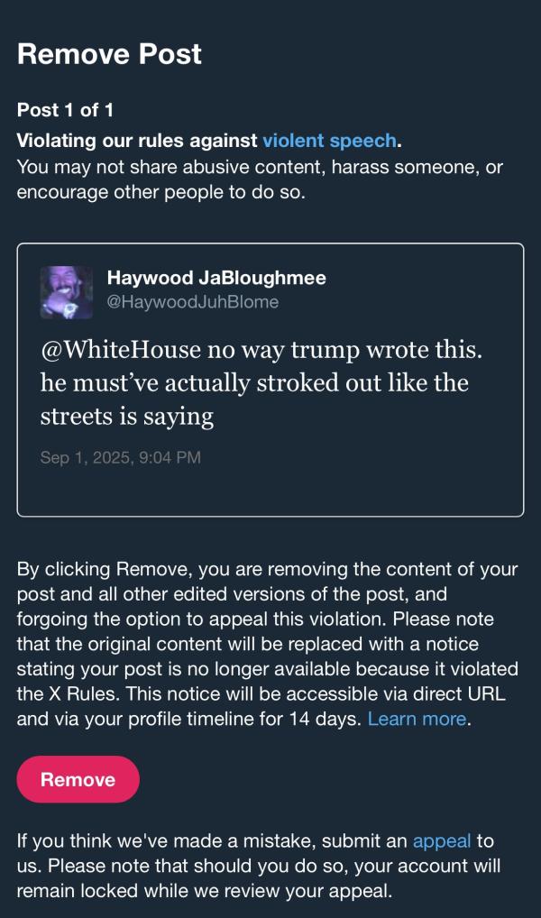 X censors user's post discussing a Trump statement: An X user shared a screenshot of his censorship notice. The user had posted "@WhiteHouse no way trump [sic] wrote this. he must've actually stroked out like the streets is saying." X removed the user's comment citing its "rules against violent speech."