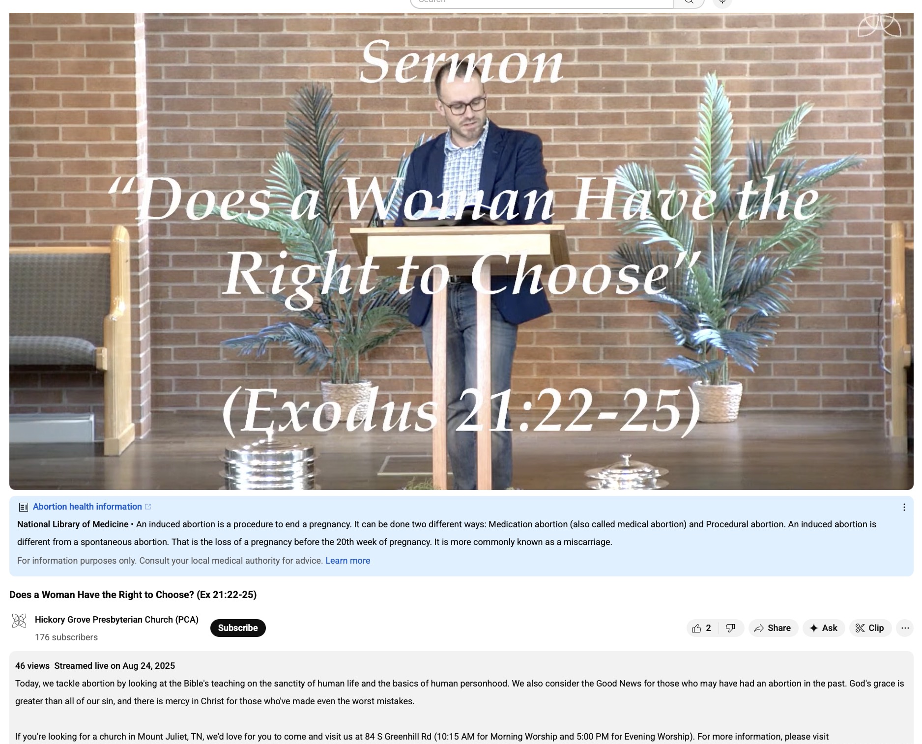 YouTube adds context label to a church sermon on the sanctity of life: YouTube imposed a fact-checking label on a sermon posted by the Hickory Grove Presbyterian Church (PCA)'s channel titled "Does a Woman Have the Right to Choose? (Ex 21:22-25)" YouTube added a context label that linked to a Medline Plus page about abortion. The label stated “National Library of Medicine - An induced abortion is a procedure to end a pregnancy. It can be done two different ways: Medication abortion (also called medical abortion) and Procedural abortion. An induced abortion is different from a spontaneous abortion. That is the loss of a pregnancy before the 20th week of pregnancy. It is more commonly known as a miscarriage. For information purposes only. Consult your local medical authority for advice. Learn more.”