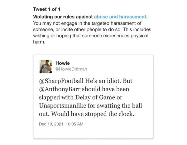 X censors user's post about football penalties: An X user shared a screenshot of the censorship notice received from the platform. The user had posted "He's an idiot. But @AnthonyBarr should have been slapped with Delay of Game or Unsportsmanlike for swatting the ball out. Would have stopped the clock." X found this post violated its "rules against abuse and harassment." The user's post was removed.
