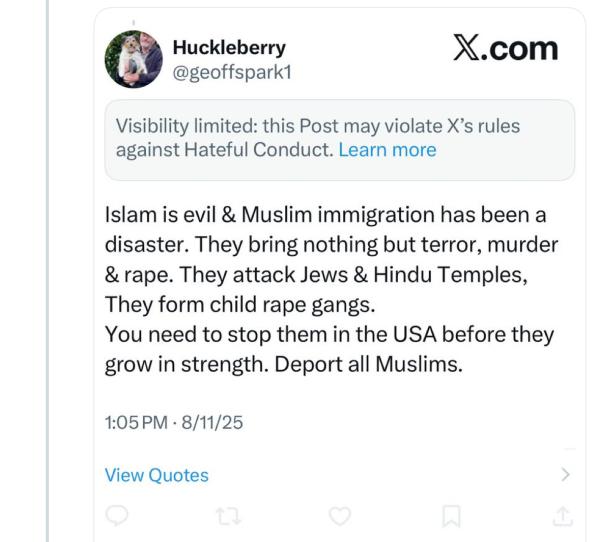 X flags angry critique of Islam for “hateful conduct”: Commentator Marina Medvin shared a screenshot of an X account apparently titled “Kick a pregnant jew in the stomach groyper,” an account which still remains on X as of the afternoon of August 11. “I don’t understand why an automated system isn’t integrated into X to flag accounts like these as violent,” Medvin complained. She added, “The thing is — X does have automatic detection. Just not when it comes to Jews.” She shared a screenshot of an August 11 post from a user called Huckleberry who had posted, “Islam is evil & Muslim immigration has been a disaster. They bring nothing but terror, murder & rape. They attack Jews & Hindu Temples, They form rape gangs. You need to stop them in the USA before they grow in strength. Deport all Muslims.” X’s label on the post stated, “Visibility limited: this Post may violate X’s rules against Hateful Conduct.”