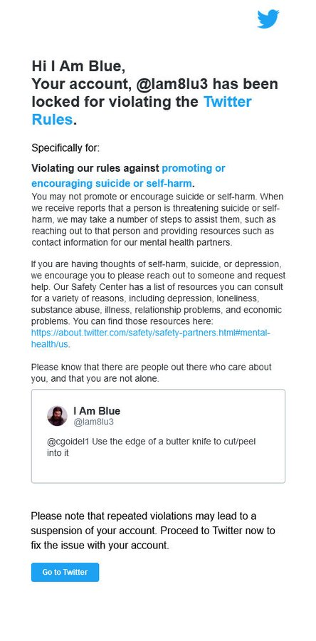 X censors user for post about how to open a jar of peanut butter: An X user shared a screenshot of another user's censorship notice. The censored user had posted "Use the edge of a butter knife to cut/peel into it." The user was responding to a question of how to open a jar of peanut butter. X claimed the post violated its "rules against promoting or encouraging suicide or self-harm." The user's account was locked until the post was removed.