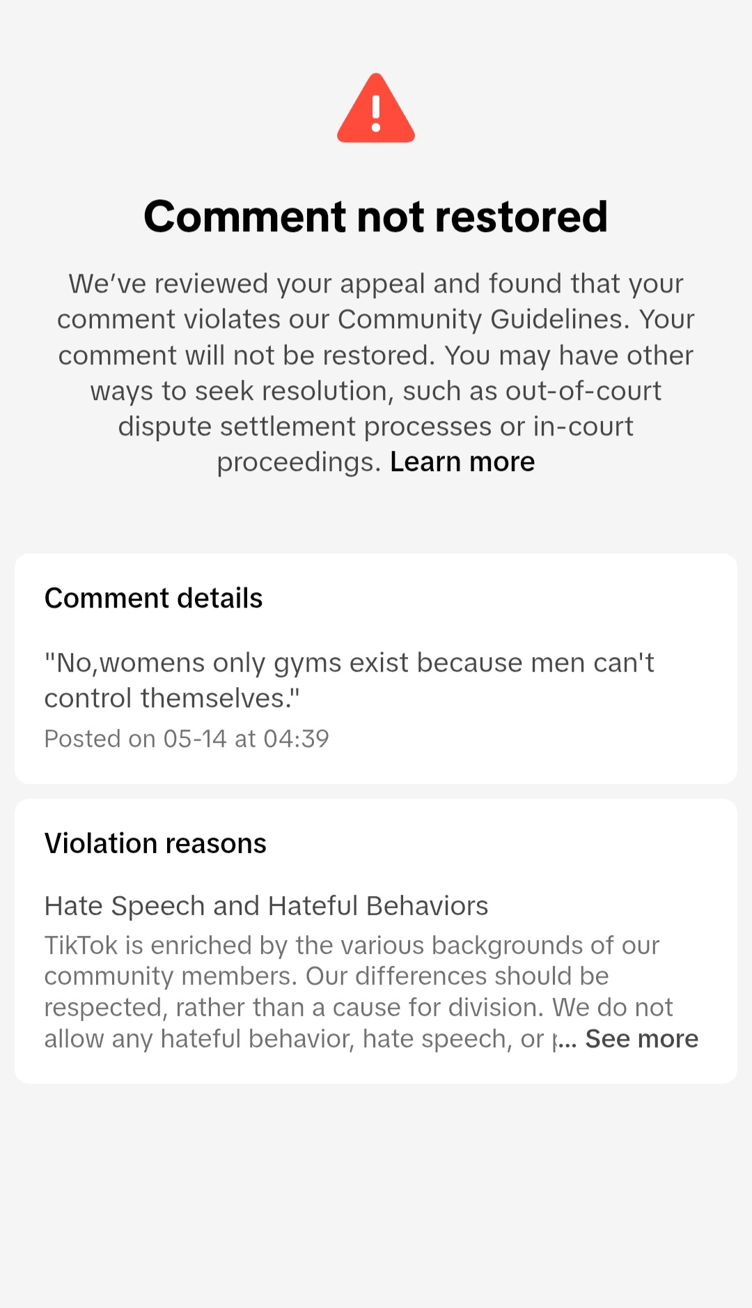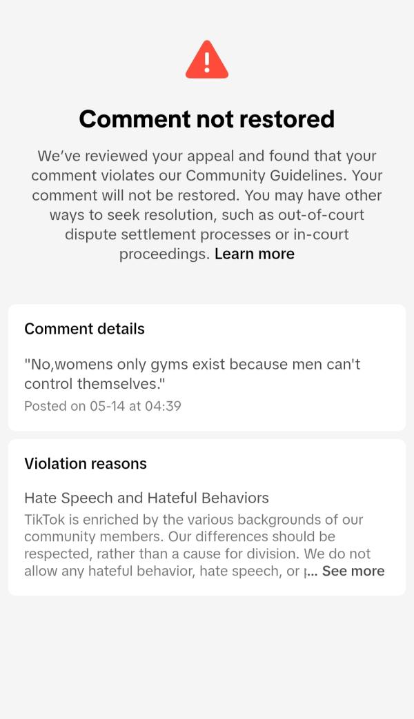 TikTok removed user's comment: An X user shared a screenshot of their TikTok censorship notice. The user had commented "No, women's only gyms exist because men can't control themselves." TikTok removed the comment, claiming that it violated the platform's Community Guidelines on "Hate Speech and Hateful Behaviors."
