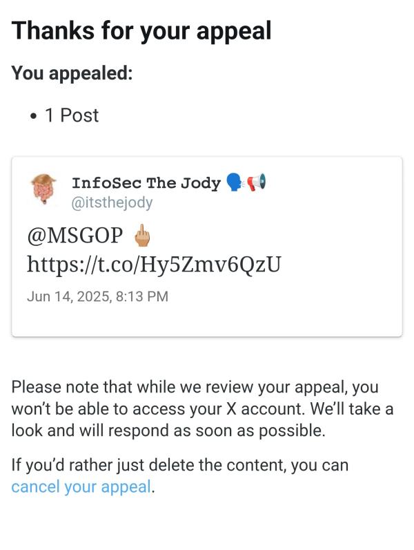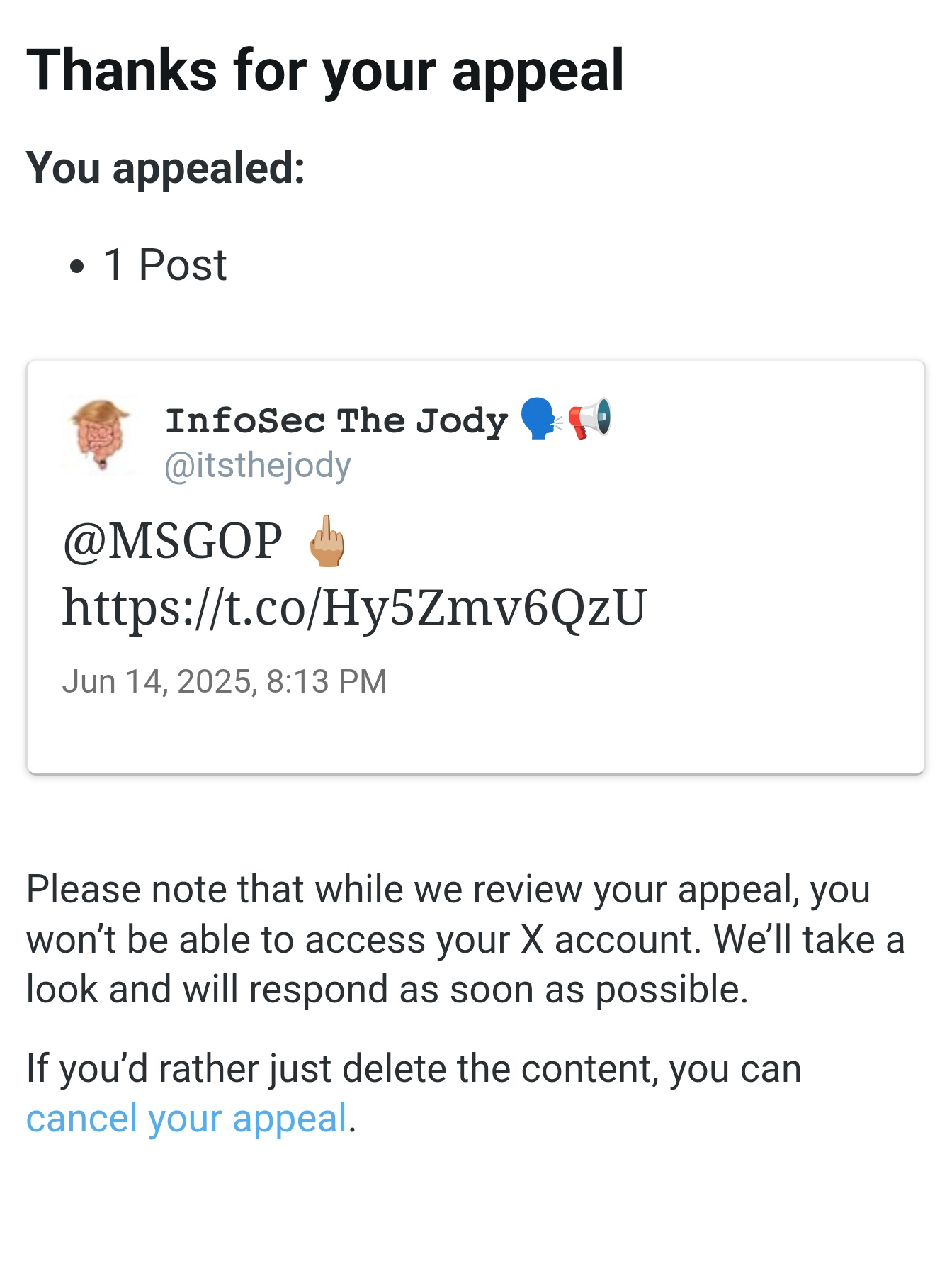 X censors user's post of the middle finger emoji: An X user shared a screenshot of the censorship notice received from the platform. The user had posted a comment to another user with only the middle finger emoji. X censored the post, and rejected the user's appeal over the censorship.