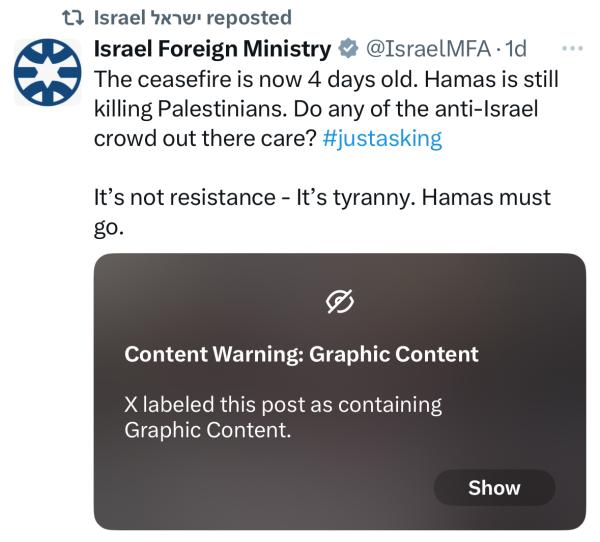 X imposed filter on video of Islamic terrorist mass execution: On Oct. 14, Israel’s Foreign Ministry shared a video of Hamas jihadis executing multiple Gazans as part of its new campaign of terror within Gaza following the ceasefire. The ministry commented, “The ceasefire is now 4 days old. Hamas is still killing Palestinians. Do any of the anti-Israel crowd out there care? #justasking It’s not resistance - It’s tyranny. Hamas must go.” X imposed a label stating “Content Warning: Graphic Content.”