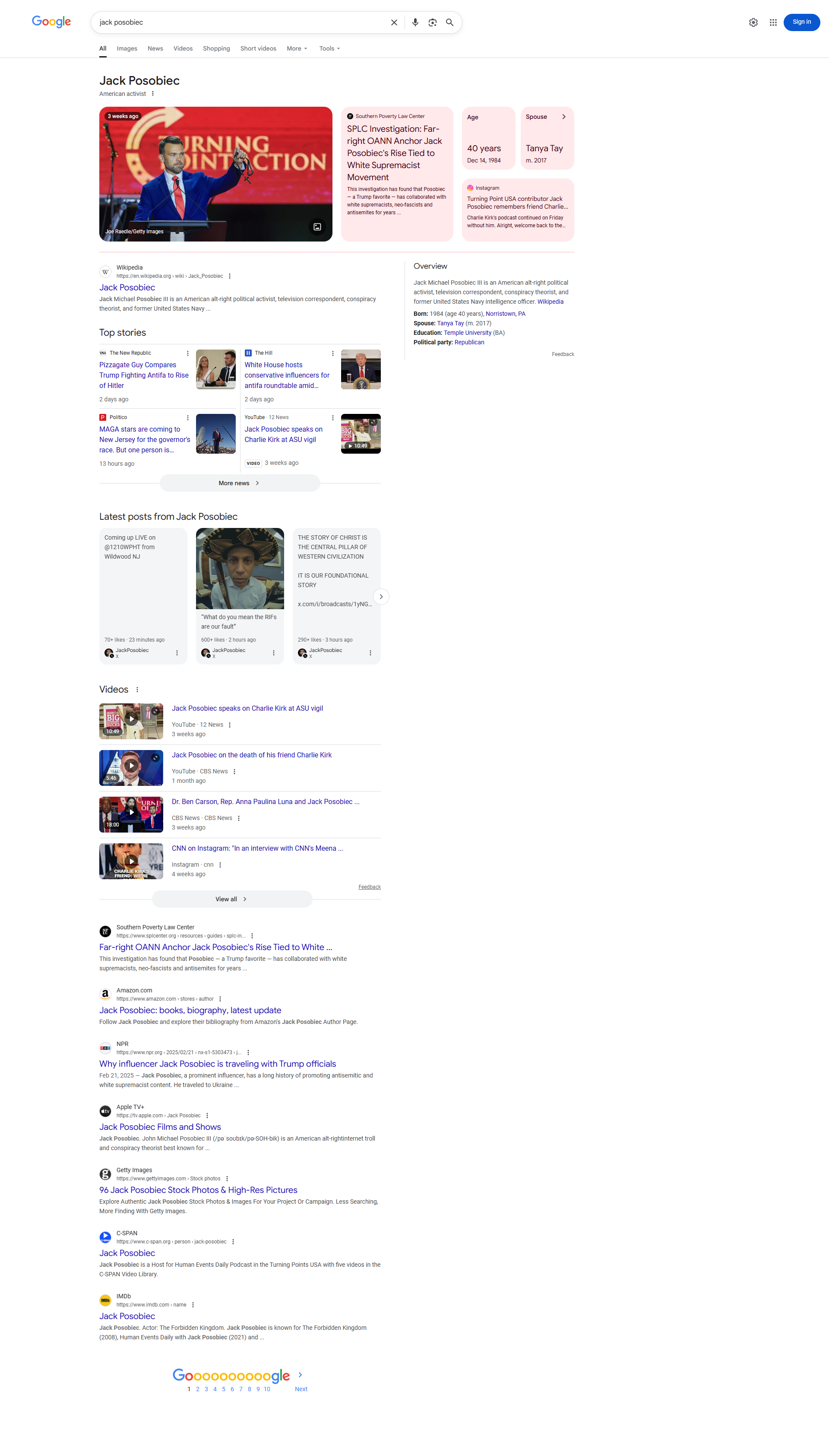 Google suppresses relevant and neutral results for Republican media figures: Multiple MRC Free Speech America (MRCFSA) studies have exposed how Google has suppressed right-leaning websites in search. MRCFSA researchers conducted a Google search for the words "Jack Posobiec" on October 20, 2025 to find the podcast host and veteran Navy intelligence officer's profile or a link to his website or news outlet. The first page of search results that Google displayed began by highlighting his Wikipedia entry, his Southern Poverty Law Center profile, and his Instagram page. The search results then included several articles about Posobiec from left-leaning outlets, some videos from his YouTube channel, and some of his most recent social media posts. The first actual search result provided was a link to the SPLC profile, followed by a link to find Posobiec's books on Amazon. While the search results included some of Posobiec's content, it prioritized Wikipedia and SPLC content about Posobiec higher on the search results page, thus suppressing relevant and personal content about and by Posobiec.