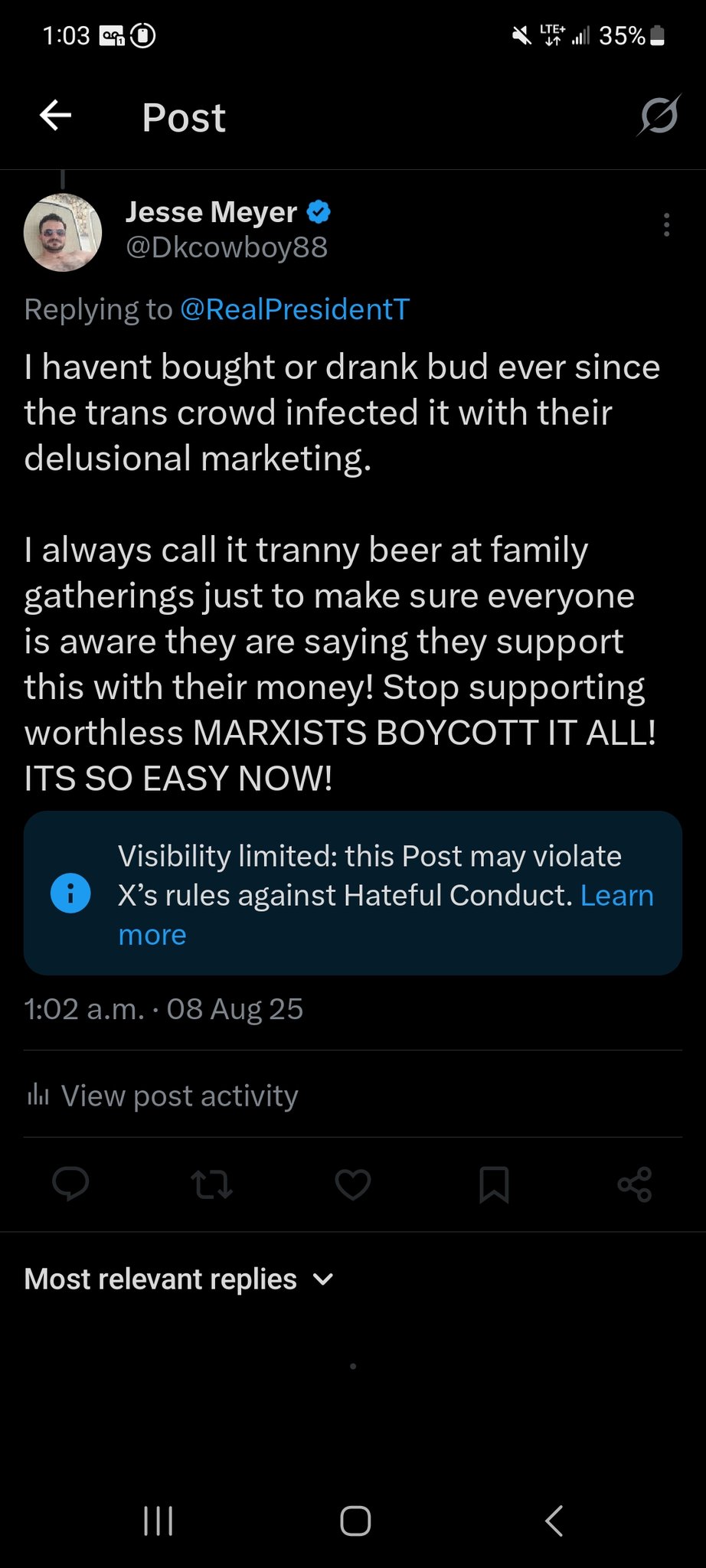 X censors user's post about boycotting Bud Light: An X user shared a screenshot of the censorship notice sent by X. The user had posted "I havent bought or drank bud ever since the trans crowd infected it with their delusional marketing. I always call it tranny beer at family gatherings just to make sure everyone is aware they are saying they support this with their money! Stop supporting worthless MARXISTS BOYCOTT IT ALL! ITS SO EASY NOW!." X flagged the post, stating that its visibility had been limited because it "violated our rules against Hateful Conduct."