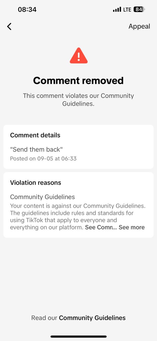 TikTok removes comment about Palestinian immigrants to Europe: An X user shared a screenshot of his TikTok censorship notice. The user had posted "Send them back." The user clarified, "don't say send Palestinians back to Palestine. Europe is being overrun with young Muslim men but don't tell the truth on TikTok." TikTok removed the comment, citing only that it went "against our Community Guidelines."