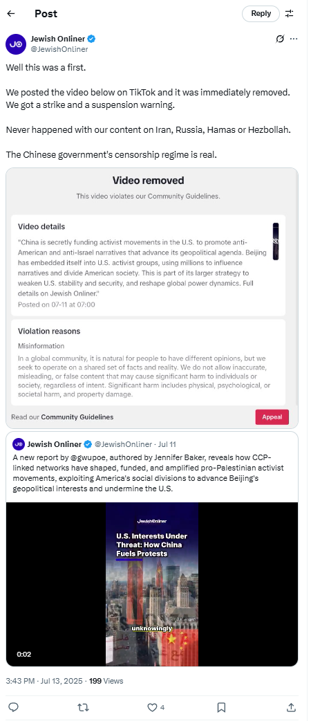 TikTok removes video from Jewish Onliner criticizing China: A Jewish Substack on X shared a screenshot of a censorship notice from TikTok. The censored video was captioned, "China is secretly funding activist movements in the U.S. to promote anti-American and anti-Israel narratives that advance its geopolitical agenda. Beijing has embedded itself into U.S. activist groups, using millions to influence narratives and divide American society. This is part of its larger strategy to weaken U.S. stability and security, and reshape global power dynamics. Full details on Jewish Onliner." TikTok claimed the video violated its community guidelines on misinformation. The platform removed the video.