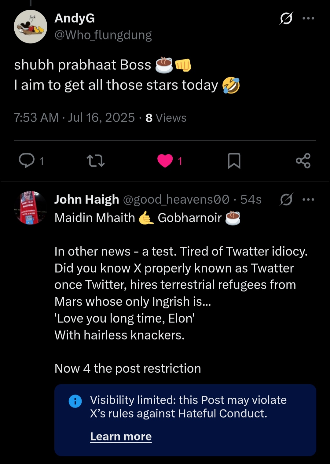X censors user's post regarding X: An X user shared a screenshot that he received from the platform. The user had posted "Maidin Mhaith Gobharnoir. In other news - a test. Tired of Twatter idiocy. Did you know X properly known as Twatter was once Twitter, hired terrestrial refugees from Mars whose only Ingresh is... 'Love you long time, Elon.' With hairless knackers. Now 4 the post restriction." X claimed this post "may violate X's rules against Hateful Conduct." As a result, the platform limited the post's visibility.