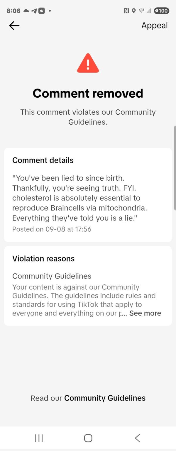 TikTok removes comment about healthcare: An X user shared a screenshot of his TikTok censorship notice. The user had posted "You've been lied to since birth. Thankfully, you're seeing truth. FYI. cholesterol is absolutely essential to reproduce Braincells via mitochondria. Everything they've told you is a lie." TikTok removed the comment, citing only that it went "against our Community Guidelines."
